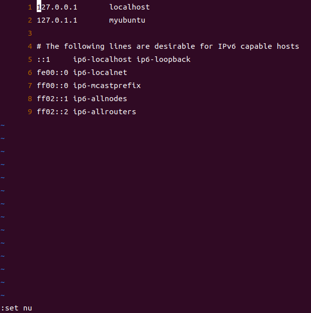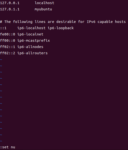 | set nu | 파일 내용의 각 행에 행 번호를 표시한다. (보이기만 하고 저장은 되지 않는다.) |
