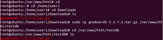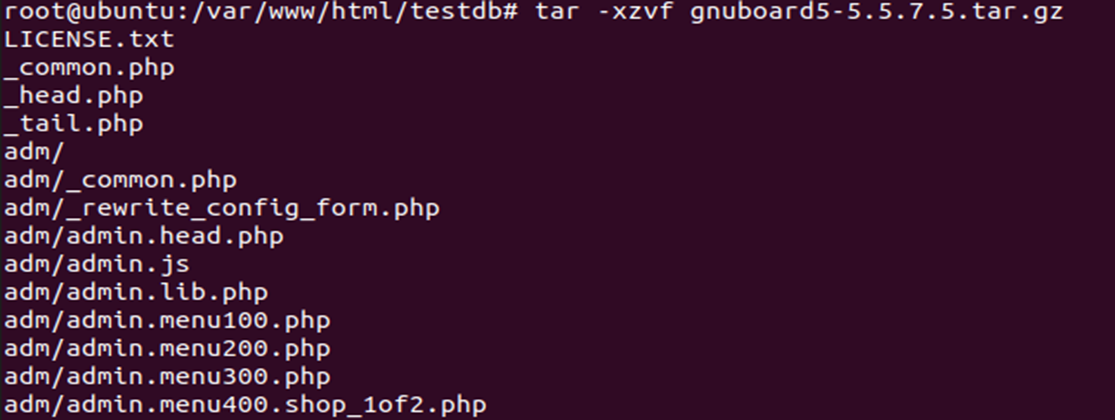 그리고 그누보드 다운로드 경로로 넘어가 gzip 파일을 testdb 디렉터리로 복사했습니다. 그리고 cd를 통해 testdb 디렉터리로 이동했습니다.