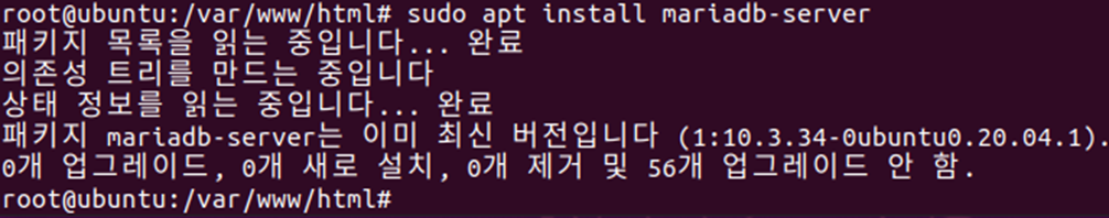 위 명령어로 mariadb를 설치했습니다. 저는 이미 패키지를 받아놓았기 때문에 위와 같이 출력됐지만, 다소 시간이 소요됩니다.
