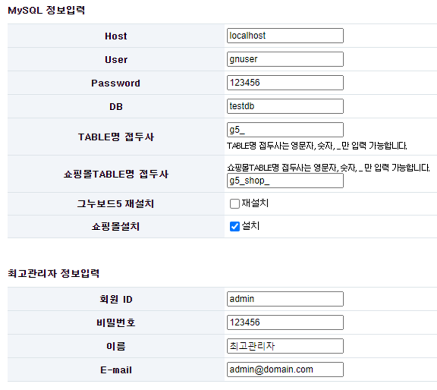 그누보드의 관리자 정보인데, 해당 부분에서 오탈자가 발생하게 되면 그누보드가 제대로 작동하지 않으니 이 부분에 유의하며 오탈자 없이 작성해야 합니다.
