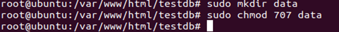 testdb 디렉터리로 접근해 mkdir 옵션을 통해 data 디렉터리를 생성했습니다. 그리고 접근권한은 707으로 설정했습니다.