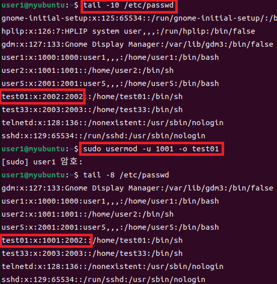 저는 test01의 UID를 수정해봤습니다. 기존 UID 값이 2002였는데, 1001으로 바꿨습니다. 기존 UID 1001값을 가지고 있던 user2와 중복되었기 때문에 -o 옵션을 추가했습니다.
