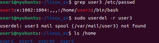 일단 grep을 통해 user3에 대한 정보를 한번 보고, userdel -r 옵션을 통해 user3을 완전히 삭제했습니다. /home 디렉터리를 살펴보면 user3이 없는 것을 확인할 수 있습니다.