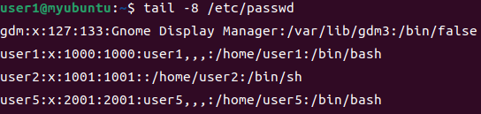 user2는 아이디를 지정하지 않고 해서 기존에 있던 user1에서 +1된 값이 부여됐습니다. 반면 UID 값을 2001으로 지정 후 생성한 user5는 2001번으로 지정된 것을 볼 수 있습니다. GID값 또한 UID값을 따라 2001번으로 지정됐습니다.