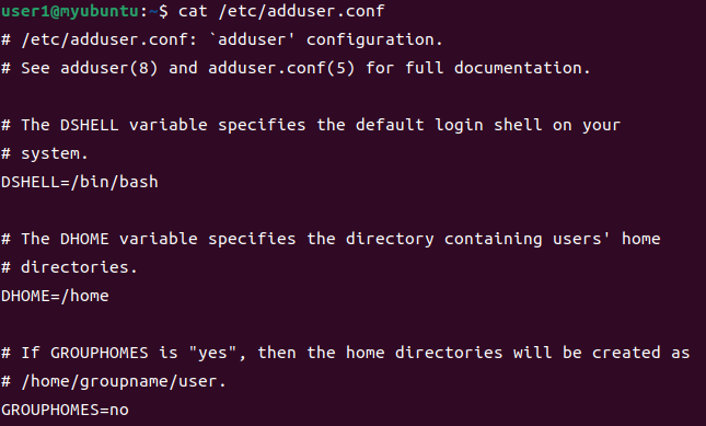 adduser 명령의 기본 설정은 /etc/adduser.conf에 저장되어 있습니다. 기본 셸은 /bin/bash이고, 첫번째 사용자 계정의 UID는 1000번부터 시작하도록 되어 있습니다.