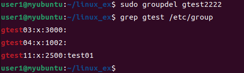 | - 기능 : 그룹을 삭제한다. - 형식 : groupdel 그룹명 - 사용 예 : groupdel gtest |
