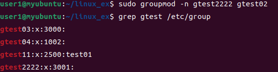 그룹명을 바꾸는 옵션은 -n 입니다. 그룹명이 바뀌면 기존 파일이나 디렉터리의 소속 그룹명도 자동으로 바뀌게 됩니다. 이름만 바뀌었을뿐 같은 GID 이기 때문입니다. 이번에는 gtest02를 gtest2222로 바꿔보겠습니다.