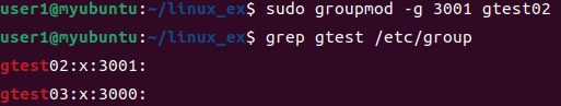| - 기능 : 그룹 정보를 수정한다. - 형식 : groupmod [옵션] 그룹명 - 옵션 : -g gid : 그룹의 GID를 수정한다. -o : GID의 중복을 허용한다. -n 그룹명 : 그룹명을 다른 이름으로 바꾼다. - 사용 예 groupmod -g 3001 gtest groupmod -g 3001 -o gtest22 groupmod -n gtest1 gtest |