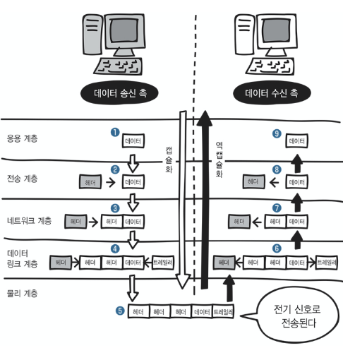 간단하게 이야기하자면 캡슐화는 데이터를 송신할 때 헤더, 트레일러가 달라붙는 과정이고, 역캡슐화는 이렇게 캡슐화된 정보를 제거해난가는 과정이라고 할 수 있을 겁니다.