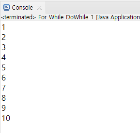 대표적으로 많이 쓰이는 for 반복문을 통해 1~10까지 출력을 진행해봤습니다.