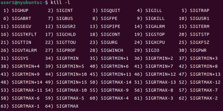시그널은 프로세스에 무슨 일이 발생했음을 알려주는 메시지입니다. 이 메시지에는 어떤 일이 발생했는지 알려주는 상수를 사용합니다. 시그널은 번호로 분류되고, 각각 이름을 가지고 있습니다. 시그널을 받은 프로세스는 기본적으로 종료됩니다. 리눅스에서 지원하는 시그널의 목록은 kill -l 명령으로 확인이 가능합니다.